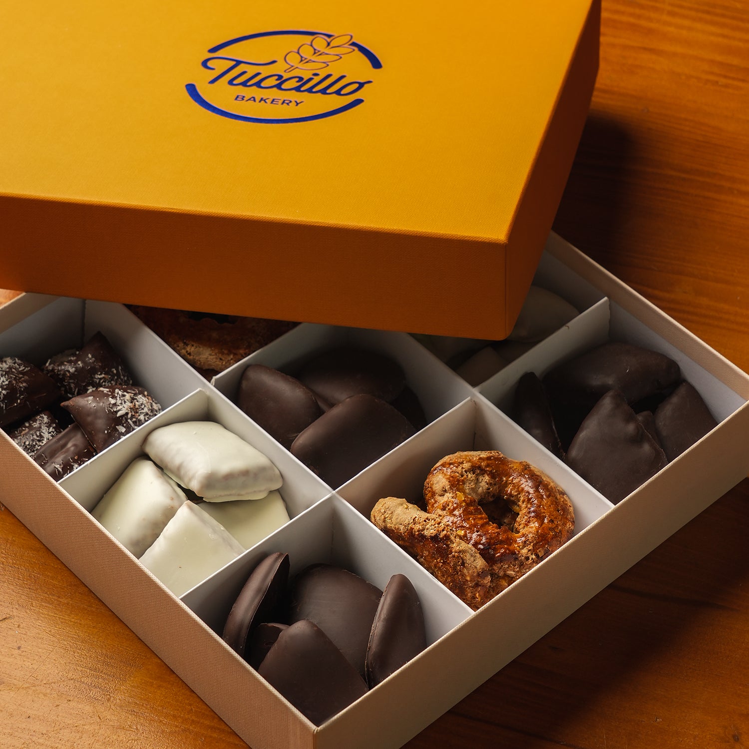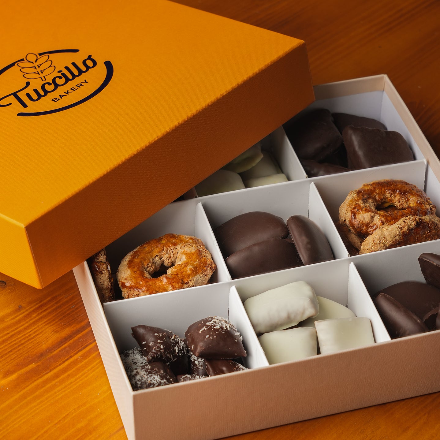Celebra il Natale con il Box Natale da Tuccillo! Gusta la nostra selezione di mostaccioli artigianali in svariati gusti, come Nutella, cioccolato bianco, pistacchio, cocco, amarena e caramello. Accompagnati dal delizioso roccocò, è il regalo perfetto per festeggiare con la famiglia e gli amici.